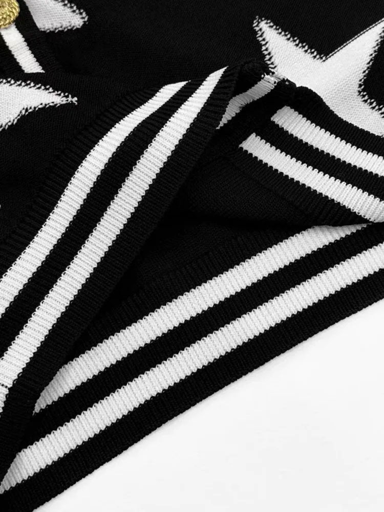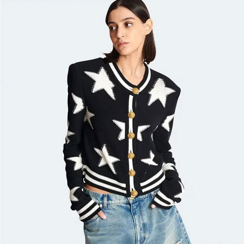 Deze gebreide cardigan met gouden knopen en jacquardpatroon biedt een luxe uitstraling. Geschikt voor informele en zakelijke gelegenheden, kan deze worden gewassen op een fijnwasprogramma. Combineer met een nette broek of rok voor een complete look.